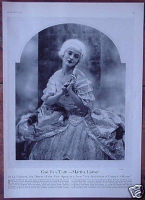 Martha Lorber's Broadway career began when she was a teenager and included roles in "Over the Top" (1917-1918), "Mecca" (1920-1921), "Tangerine" (1922), "Ziegfeld Follies from 1922 "," Ziegfeld Follies from 1923 "," Ziegfeld Follies from 1924 "," Mozart "(1926) and" Three Little Girls "(1930). The Ziegfeld Follies were a year revue, then one of the leading on Broadway. The Ziegfeld Follies were named after their producer Florenz Ziegfeld Jr. and were based on the Parisian Folies Bergère. They had no plot, but a program composed of numbers that changed every year. In the center was a series of long-legged chorus girls who danced synchronous figures. Because the theater was still the main distribution medium for music at the time, many famous songs started from such revues. The "Follies" were a larger, less disreputable type of stage spectacle than the American Vaudeville and the Burlesque. Florence Ziegfeld, along with his competitor George M. Cohan, was the most influential revue producer on Broadway.
